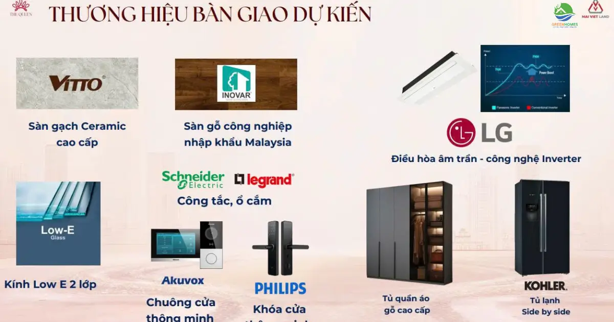 Chủ đầu tư đã cam kết bàn giao căn hộ The Queen với danh mục nội thất cao cấp từ các thương hiệu hàng đầu thế giới, đảm bảo sự sang trọng, bền bỉ và tiện nghi tối đa.